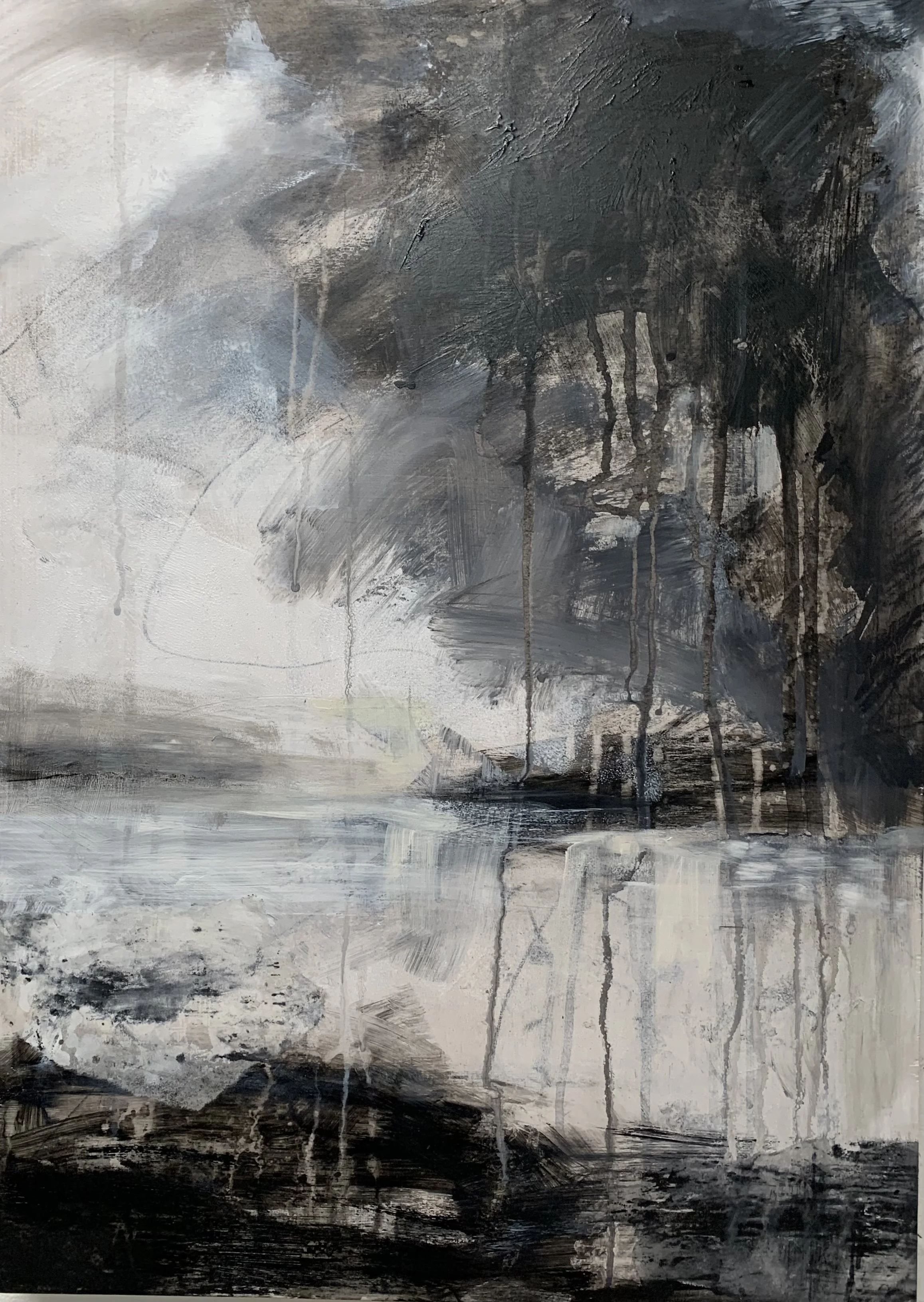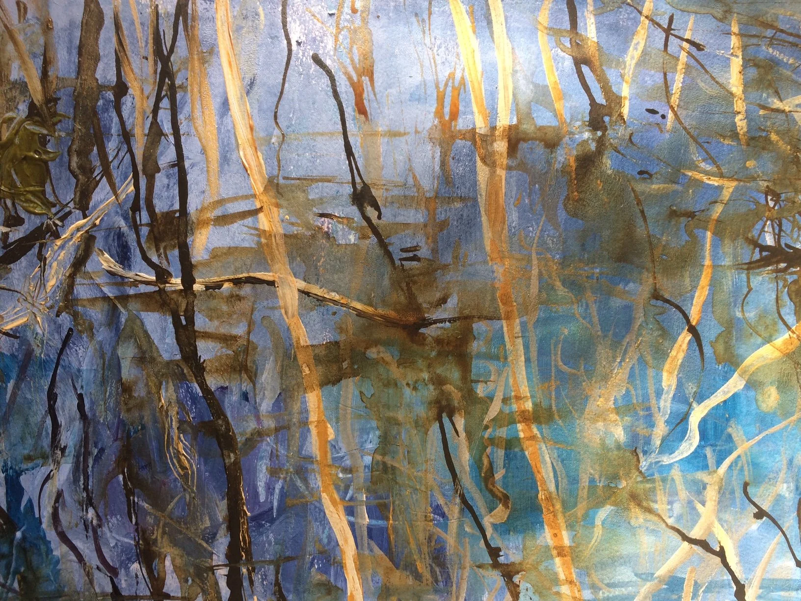 Deborah Richards created semi-abstract oil-on-paper monotypes inspired by the twisted remains of the lock gates at Birdham, archive photographs, and Turner’s painting of the canal. Her raku porcelain fish reference those in the canal. Sandra Izard was also inspired by Turner, and she used mixed media in her semi-abstract responses to the clear reflections that the still canal waters allow. Reflections caught Catharine Somerville’s attention as well. They led her to consider those of the past, present and future as she produced loose, intuitive paintings in oils.