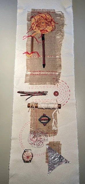 I have always collected things that fascinate me. Found objects appear everywhere, found treasures! These can be old, broken, man-made or nature made, they all have different kinds of beauty. The first challenge is to see how they work together, be attached to a backing and then displayed. With my textile background tying, knotting and stitching play a big part, as there are often awkward shapes involved and a line of thread brings another element. The biggest challenge is to turn items of detritus into objects of desire and attraction.