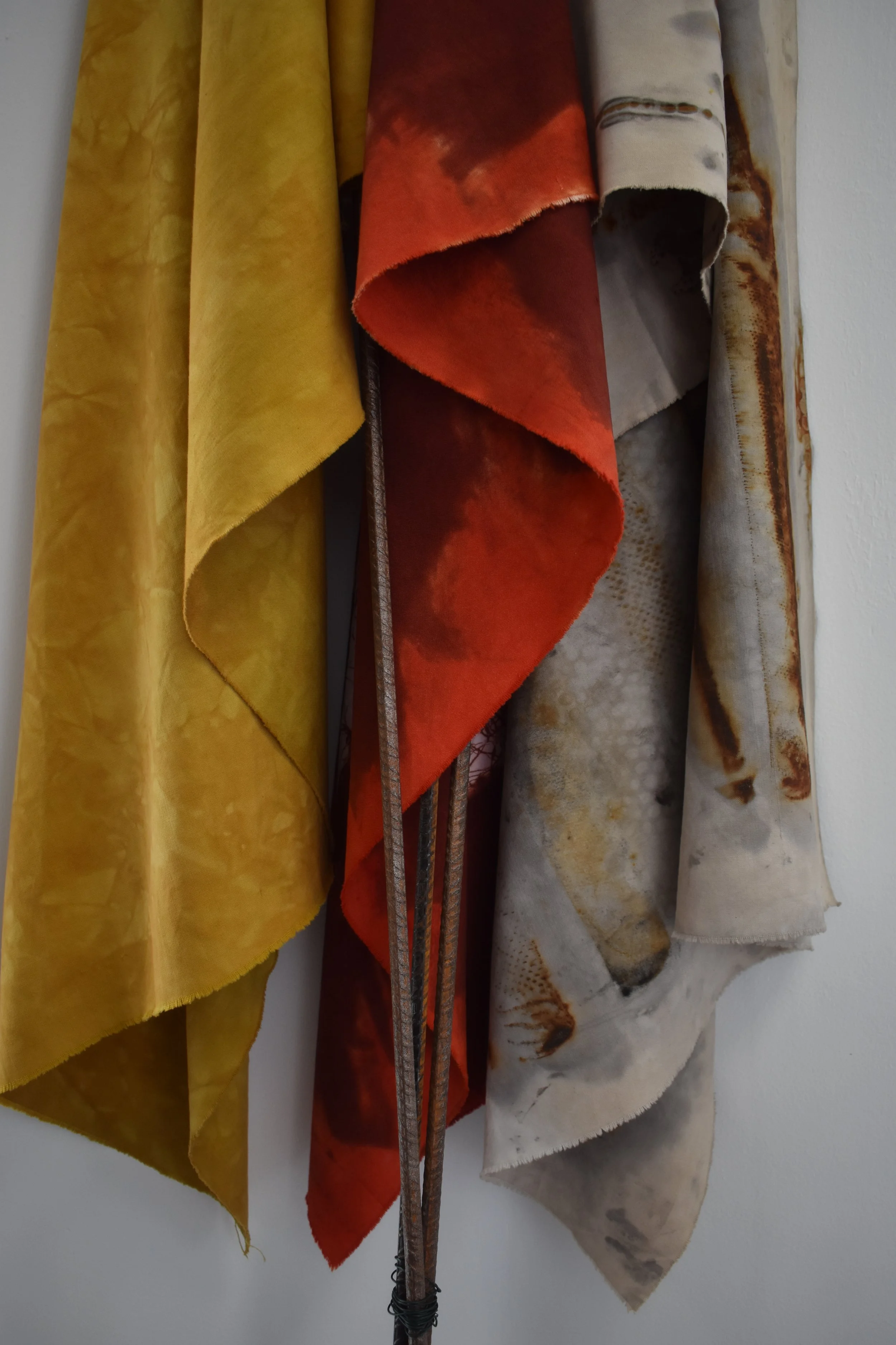 Starting with inherited bed linen, I use dyeing and printing processes to leave traces evoking order and disorder, unravelling and repair, stains and networks. I am inspired by my German Jewish great-grandmother’s heritage of migration and hoarding domestic textiles. Whilst my tools and language are domestic, my work looks at the fabric of our society.